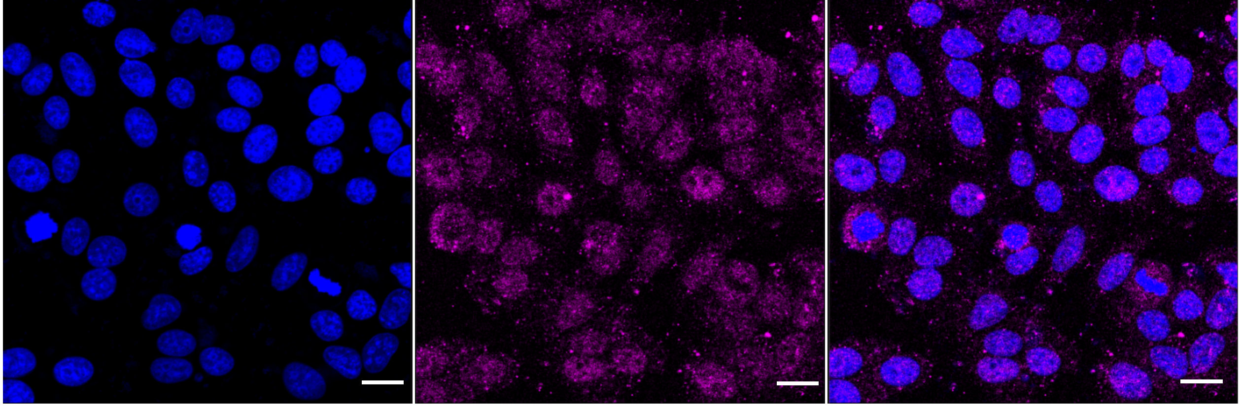 Immunocytochemical staining of HepG2 cells with hippocalcin antibody. Nuclei were stained blue with DAPI; Hippocalcin was stained magenta with Alexa Fluor? 647. Images were taken using Leica stellaris 5. Protein abundance based on laser Intensity and smart gain: Medium. Scale bar: 20 μm.