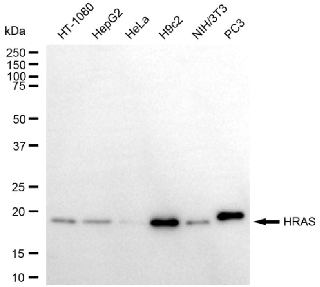 Western blotting analysis using HRAS antibody. Total cell lysates (30 μg) from various cell lines were loaded and separated by SDS-PAGE. The blot was incubated with HRAS antibody and HRP-conjugated goat anti-rabbit secondary antibody respectively.