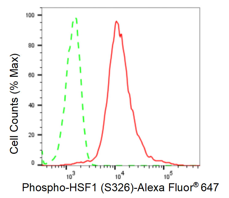 Flow cytometric analysis of Phospho-HSF1 (S326) expression in HeLa cells using Phospho-HSF1 (S326) antibody. Green, isotype control; red, Phospho-HSF1 (S326).