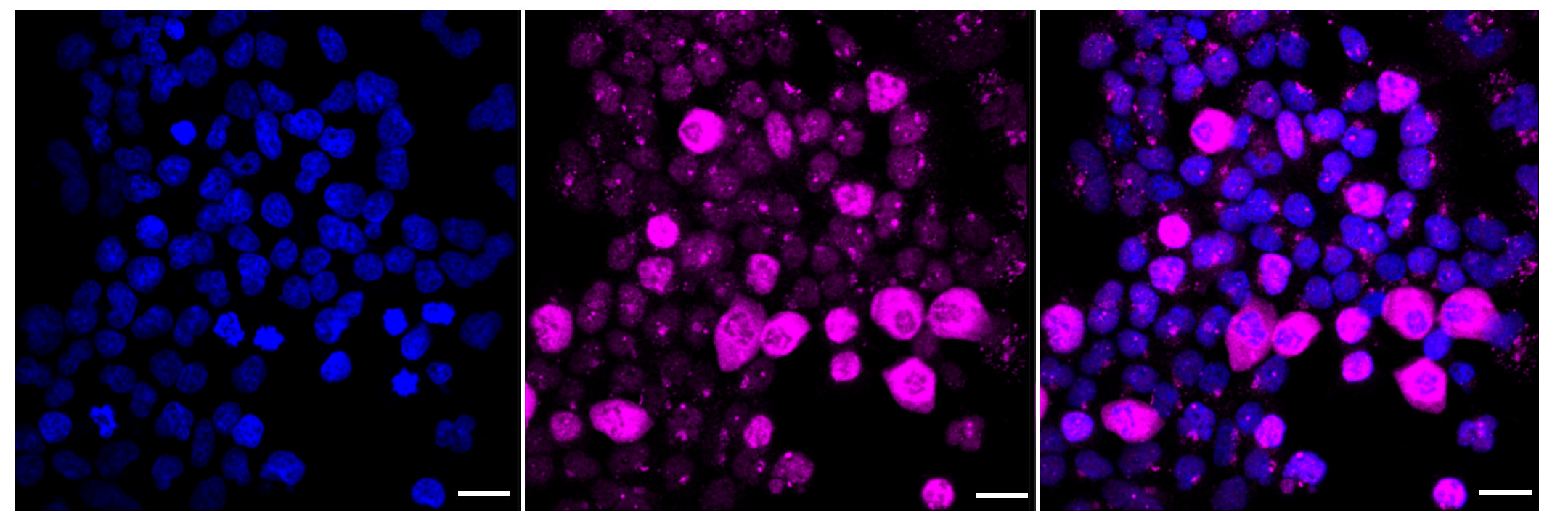 Immunocytochemical staining of HeLa cells with Phospho-HSF1 (S326) antibody. Nuclei were stained blue with DAPI; Phospho-HSF1 (S326) was stained magenta with Alexa Fluor? 647. Images were taken using Leica stellaris 5. Protein abundance based on laser Intensity and smart gain: High. Scale bar: 20 μm.