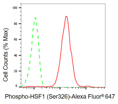 Flow cytometric analysis of phospho-HSF1 (Ser326) expression in HepG2 cells using phospho-HSF1 (Ser326) antibody. Green, isotype control; red, phospho-HSF1 (Ser326).