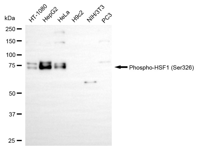 Western blotting analysis using phospho-HSF1 (Ser326) antibody. Total cell lysates (30 μg) from various cell lines were loaded and separated by SDS-PAGE. The blot was incubated with phospho-HSF1 (Ser326) antibody and HRP-conjugated goat anti-rabbit secondary antibody respectively.