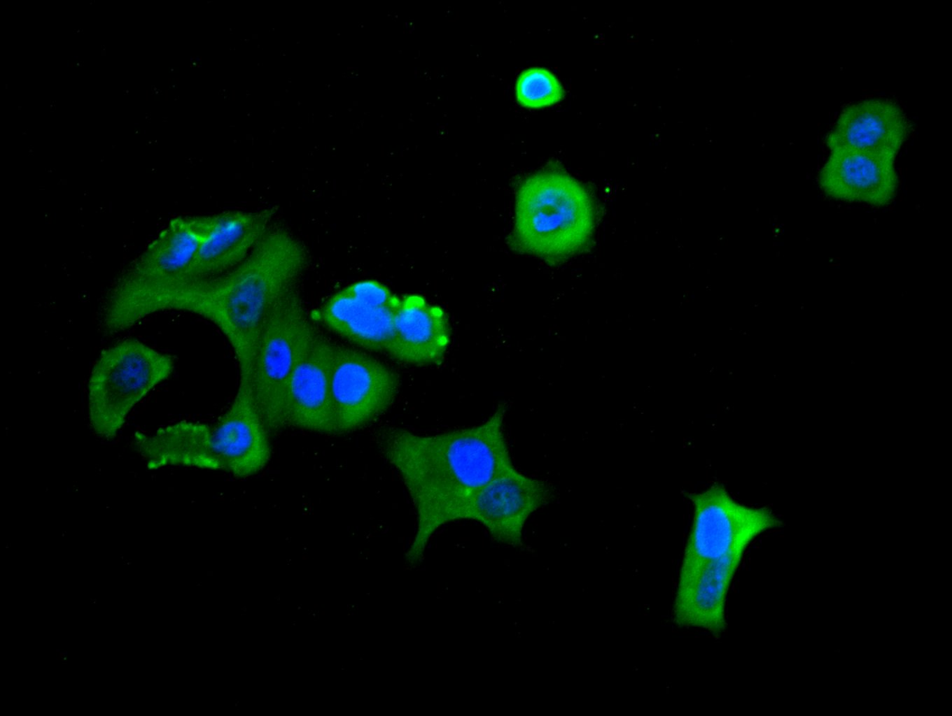 Immunofluorescence staining of MCF-7 cell with CSB-RA010829MA1HU at 1:30 counter-stained with DAPI. The cells were fixed in 4% formaldehyde, permeabilized using 0.2% Triton X-100 and blocked in 10% normal Goat Serum. The cells were then incubated with the antibody overnight at 4°C. The secondary antibody was Alexa Fluor 488-congugated AffiniPure Goat Anti-Human IgG(H+L).
