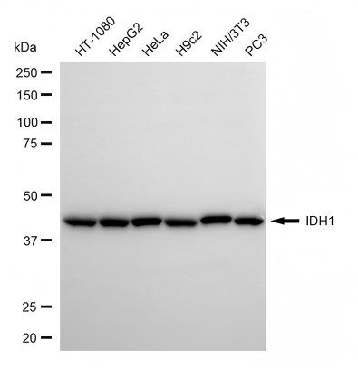 Western blotting analysis using IDH1 antibody. Total cell lysates (30 μg) from various cell lines were loaded and separated by SDS-PAGE. The blot was incubated with IDH1 antibody and HRP-conjugated goat anti-rabbit secondary antibody respectively.