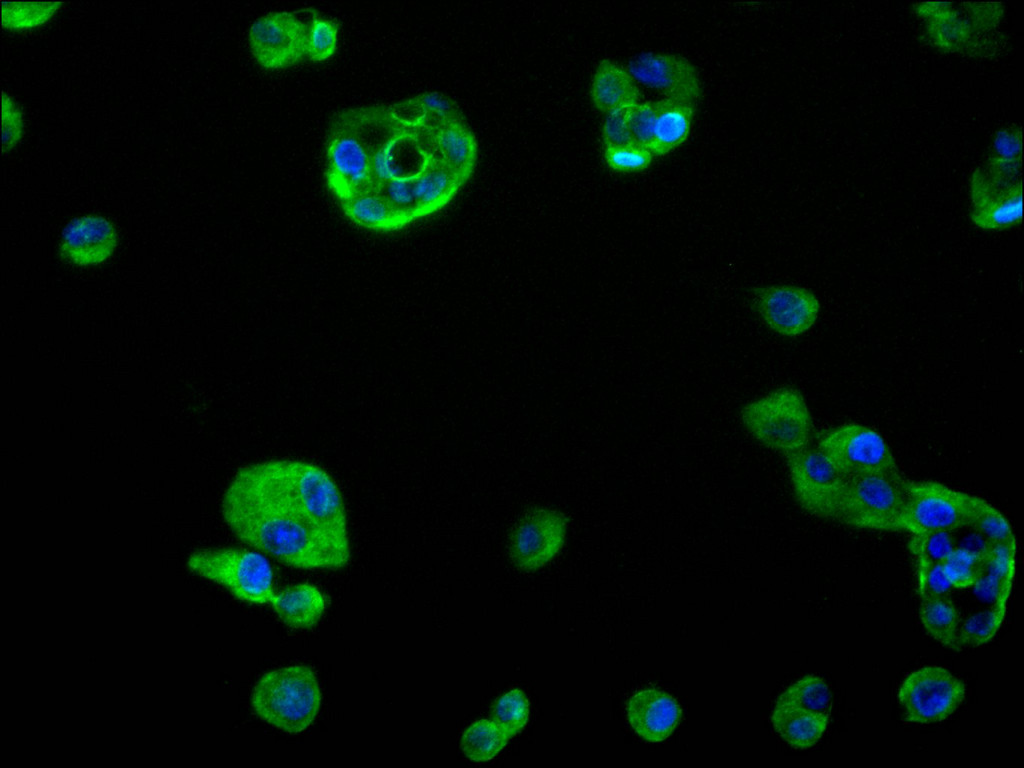 • Immunofluorescence staining of HepG2 cell with CSB-RA039517A0HU at 1:50, counter-stained with DAPI. The cells were fixed in 4% formaldehyde and blocked in 10% normal Goat Serum. The cells were then incubated with the antibody overnight at 4°C. The secondary antibody was Alexa Fluor 488-congugated AffiniPure Goat Anti-Rabbit IgG(H+L).