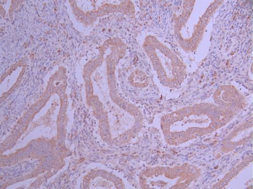 • IHC image of CSB-RA039517A0HU diluted at 1:100 and staining in paraffin-embedded human endometrial cancer/endometrial carcinoma performed on a Leica BondTM system. After dewaxing and hydration, antigen retrieval was mediated by high pressure in a citrate buffer (pH 6.0). Section was blocked with 10% normal goat serum 30min at RT. Then primary antibody (1% BSA) was incubated at 4°C overnight. The primary is detected by a Goat anti-rabbit polymer IgG labeled by HRP and visualized using 0.05% DAB.