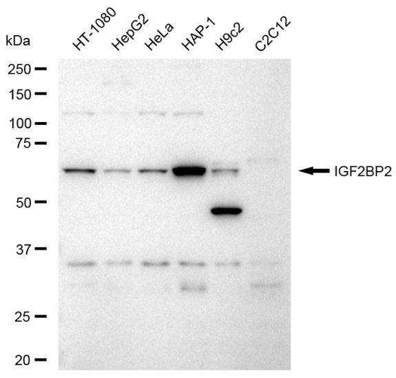Western blotting analysis using IGF2BP2 antibody. Total cell lysates (30 μg) from various cell lines were loaded and separated by SDS-PAGE. The blot was incubated with IGF2BP2 antibody and HRP-conjugated goat anti-rabbit secondary antibody respectively.