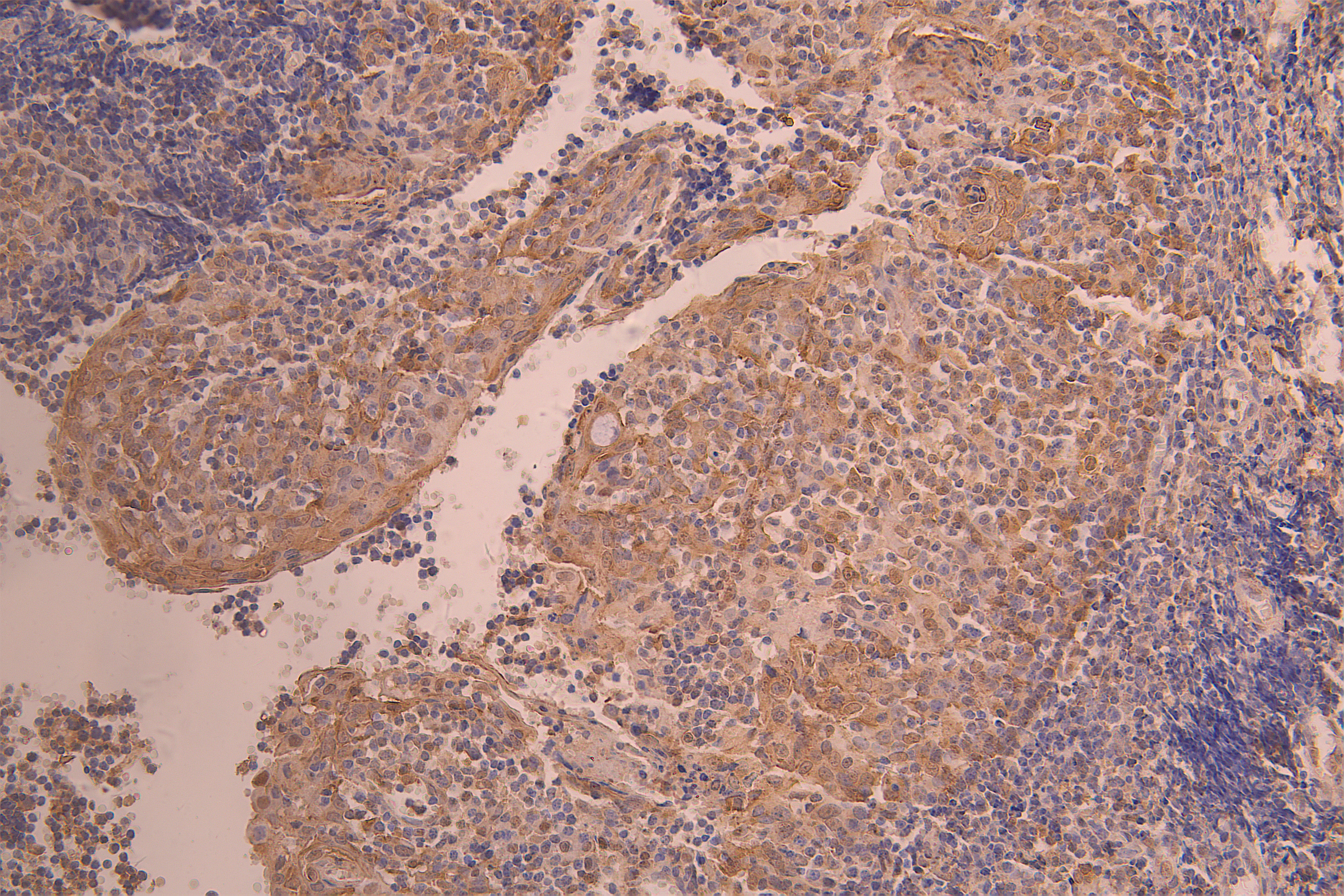 IHC image of CSB-RA011664MA3HU diluted at 1:50 and staining in paraffin-embedded human spleen tissue performed on a Leica BondTM system. After dewaxing and hydration, antigen retrieval was mediated by high pressure in a citrate buffer (pH 6.0). Section was blocked with 10% normal goat serum 30min at RT. Then primary antibody (1% BSA) was incubated at 4°C overnight. The primary is detected by a Anti-Human lgG, Fcy Fragment Specific labeled by HRP and visualized using 0.05% DAB.