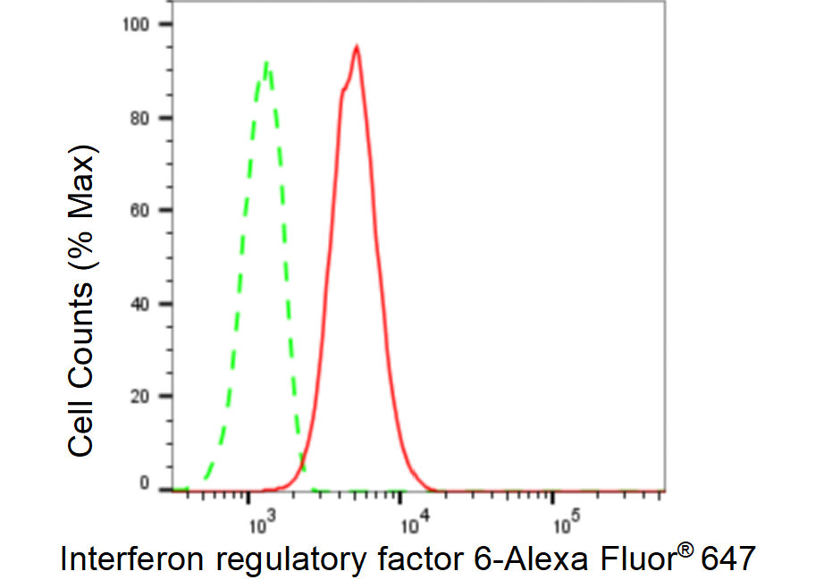 Flow cytometric analysis of Interferon regulatory factor 6 expression in C2C12 cells using Interferon regulatory factor 6 antibody. Green, isotype control; red, Interferon regulatory factor 6.