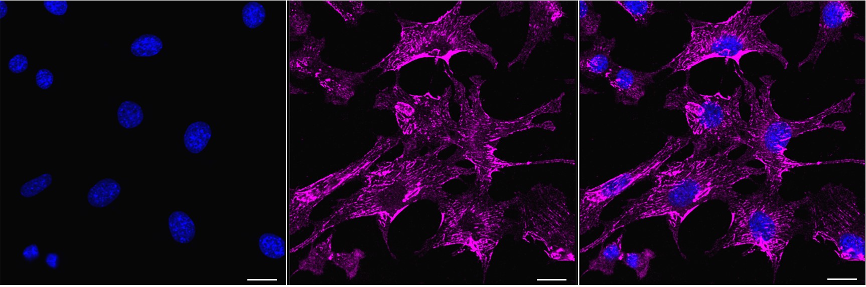 Immunocytochemical staining of C2C12 cells with ITGA5 antibody. Nuclei were stained blue with DAPI; ITGA5 was stained magenta with Alexa Fluor? 647. Images were taken using Leica stellaris 5. Protein abundance based on laser Intensity and smart gain: Medium. Scale bar, 20 μm.