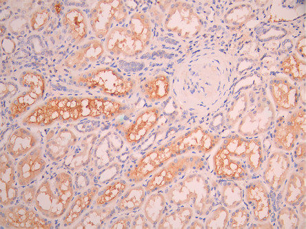 • IHC image of CSB-RA011892MA1HU diluted at 1:50 and staining in paraffin-embedded human kidney tissue performed on a Leica BondTM system. After dewaxing and hydration, antigen retrieval was mediated by high pressure in a citrate buffer (pH 6.0). Section was blocked with 10% normal goat serum 30min at RT. Then primary antibody (1% BSA) was incubated at 4°C overnight. The primary is detected by a Anti-Human lgG, Fcy Fragment Specific labeled by HRP and visualized using 0.05% DAB.