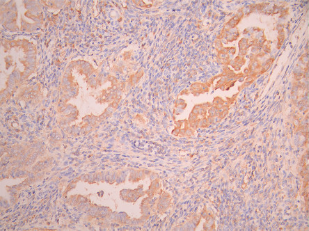 • IHC image of CSB-RA011892MA1HU diluted at 1:50 and staining in paraffin-embedded human endometrial cancer performed on a Leica BondTM system. After dewaxing and hydration, antigen retrieval was mediated by high pressure in a citrate buffer (pH 6.0). Section was blocked with 10% normal goat serum 30min at RT. Then primary antibody (1% BSA) was incubated at 4°C overnight. The primary is detected by a Anti-Human lgG, Fcy Fragment Specific labeled by HRP and visualized using 0.05% DAB.