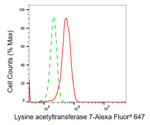 Flow cytometric analysis of lysine acetyltransferase 7 expression in HepG2 cells using lysine acetyltransferase 7 antibody. Green, isotype control; red, lysine acetyltransferase 7.
