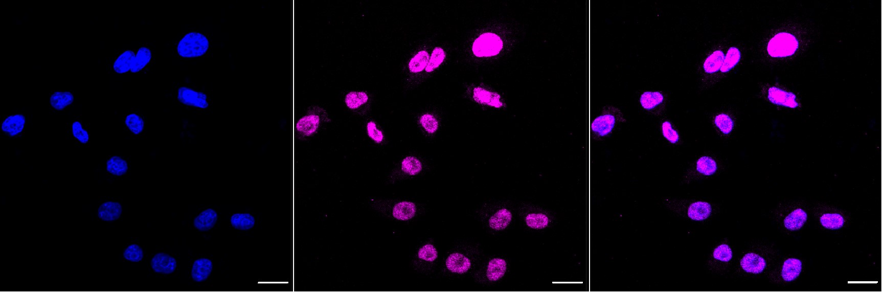 Immunocytochemical staining of HepG2 cells with Lysine acetyltransferase 7 antibody. Nuclei were stained blue with DAPI; Lysine acetyltransferase 7 was stained magenta with Alexa Fluor? 647. Images were taken using Leica stellaris 5. Protein abundance based on laser Intensity and smart gain: Medium. Scale bar, 20 μm.