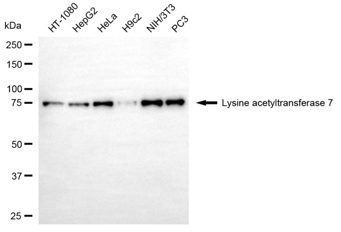 Western blotting analysis using lysine acetyltransferase 7 antibody. Total cell lysates (30 μg) from various cell lines were loaded and separated by SDS-PAGE. The blot was incubated with lysine acetyltransferase 7 antibody and HRP-conjugated goat anti-rabbit secondary antibody respectively.
