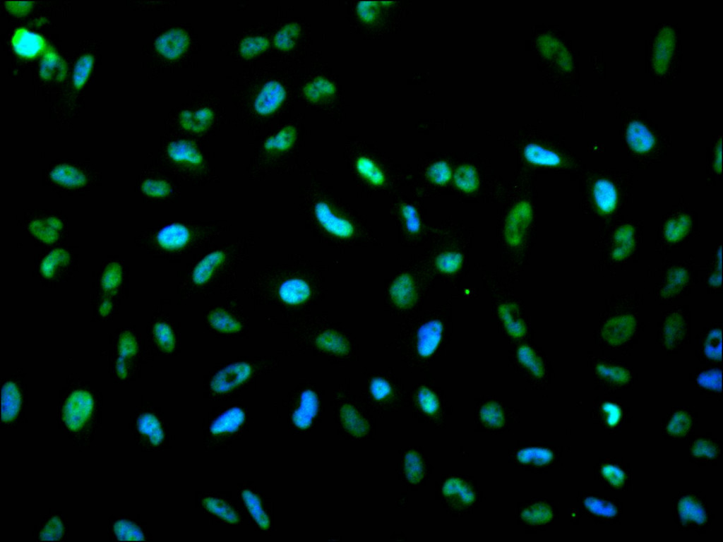 Immunofluorescence staining of U-251MG cell with CSB-RA889767A0HU at 1:50, counter-stained with DAPI. The cells were fixed in 4% formaldehyde, permeabilized using 0.2% Triton X-100 and blocked in 10% normal Goat Serum. The cells were then incubated with the antibody overnight at 4°C. The secondary antibody was Alexa Fluor 488-congugated AffiniPure Goat Anti-Rabbit IgG(H+L).