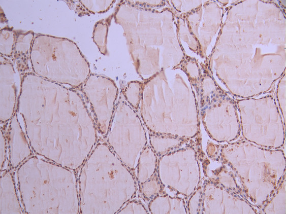 IHC image of CSB-RA889767A0HU diluted at 1:100 and staining in paraffin-embedded human thyroid tissue performed on a Leica BondTM system. After dewaxing and hydration, antigen retrieval was mediated by high pressure in a citrate buffer (pH 6.0). Section was blocked with 10% normal goat serum 30min at RT. Then primary antibody (1% BSA) was incubated at 4°C overnight. The primary is detected by a Goat anti-rabbit polymer IgG labeled by HRP and visualized using 0.05% DAB.