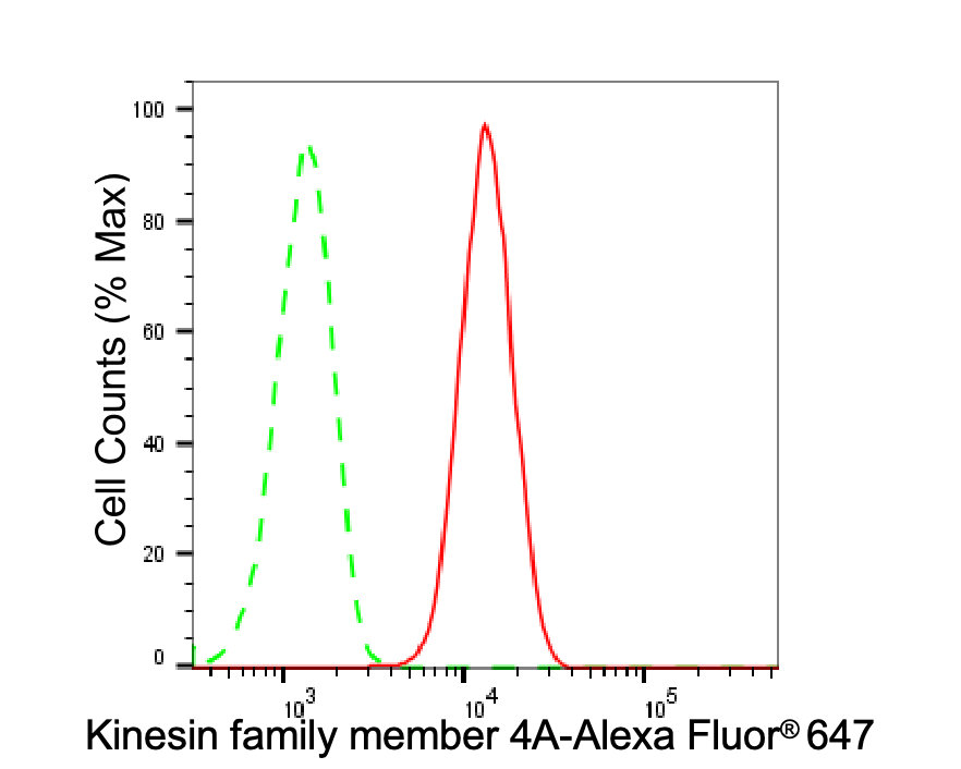 Flow cytometric analysis of Kinesin family member 4A expression in HAP-1 cells using Kinesin family member 4A antibody. Green, isotype control; red, Kinesin family member 4A.