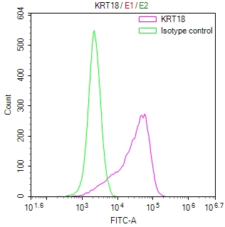 • Overlay Peak curve showing HT29 cells stained with CSB-RA012519MA1HU (red line) at 1:100. The cells were fixed in 4% formaldehyde and permeated by 0.2% TritonX-100 for 10min. Then 10% normal goat serum to block non-specific protein-protein interactions followed by the antibody (1ug/1*106cells) for 45min at 4℃. The secondary antibody used was Fluorescein (FITC) AffiniPure Goat Anti-Human IgG, Fcγ fragment specific at 1:200 dilution for 35 min at 4℃.Control antibody (green line) was human IgG1 (1ug/1*106cells) used under the same conditions. Acquisition of >10,000 events was performed.