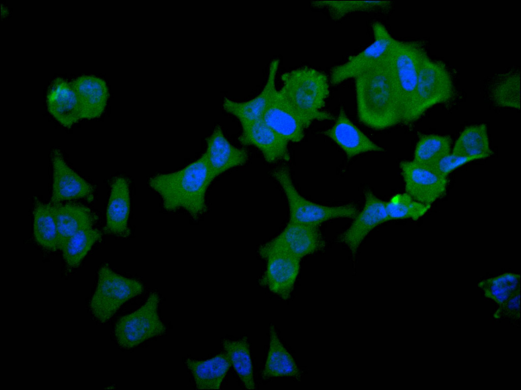 • Immunofluorescence staining of HepG2 cell with CSB-RA012519MA1HU at 1:30 ,counter-stained with DAPI. The cells were fixed in 4% formaldehyde, permeabilized using 0.2% Triton X-100 and blocked in 10% normal Goat Serum. The cells were then incubated with the antibody overnight at 4°C. The secondary antibody was Alexa Fluor 488-congugated AffiniPure Goat Anti-Human IgG(H+L).