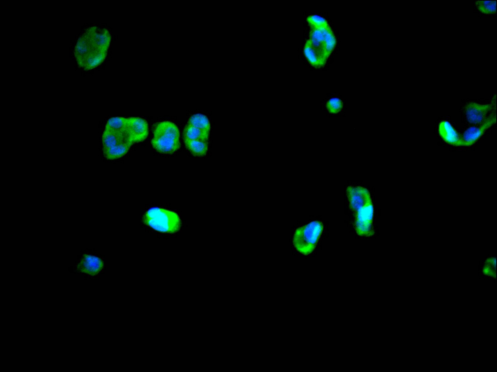 • Immunofluorescence staining of MCF-7 cell with CSB-RA012519MA1HU at 1:30 ,counter-stained with DAPI. The cells were fixed in 4% formaldehyde, permeabilized using 0.2% Triton X-100 and blocked in 10% normal Goat Serum. The cells were then incubated with the antibody overnight at 4°C. The secondary antibody was Alexa Fluor 488-congugated AffiniPure Goat Anti-Human IgG(H+L).