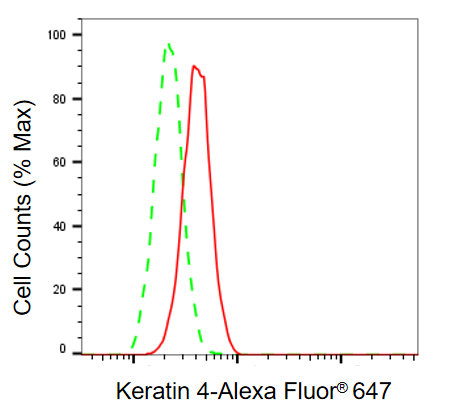 Flow cytometric analysis of keratin 4 expression in H9C2 cells using keratin 4 antibody. Green, isotype control; red, keratin 4.
