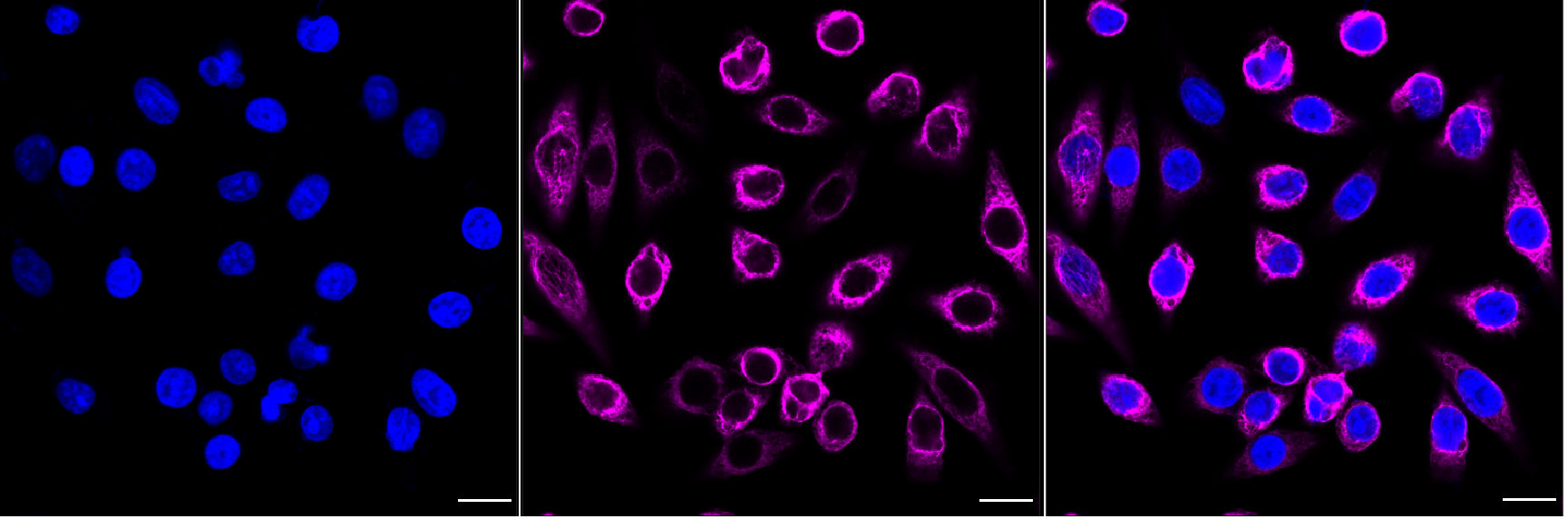 Immunocytochemical staining of HepG2 cells with Keratin 7 antibody. Nuclei were stained blue with DAPI; Keratin 7 was stained magenta with Alexa Fluor? 647. Images were taken using Leica stellaris 5. Protein abundance based on laser Intensity and smart gain:. Scale bar, 20 μm.