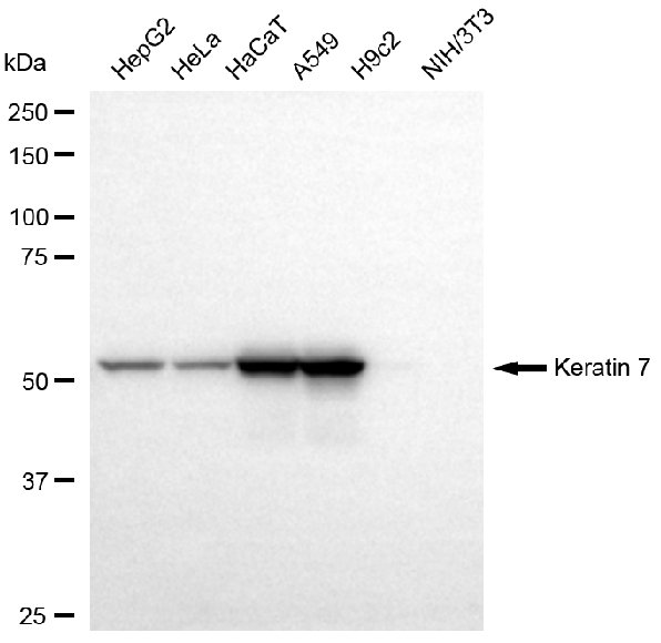 Western blotting analysis using keratin 7 antibody. Total cell lysates (30 μg) from various cell lines were loaded and separated by SDS-PAGE. The blot was incubated with keratin 7 antibody and HRP-conjugated goat anti-rabbit secondary antibody respectively.