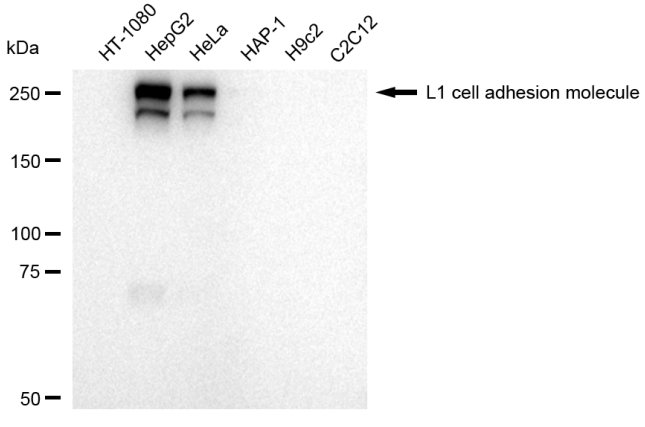 Western blotting analysis using L1 cell adhesion molecule antibody. Total cell lysates (30 μg) from various cell lines were loaded and separated by SDS-PAGE. The blot was incubated with L1 cell adhesion molecule antibody and HRP-conjugated goat anti-rabbit secondary antibody respectively.