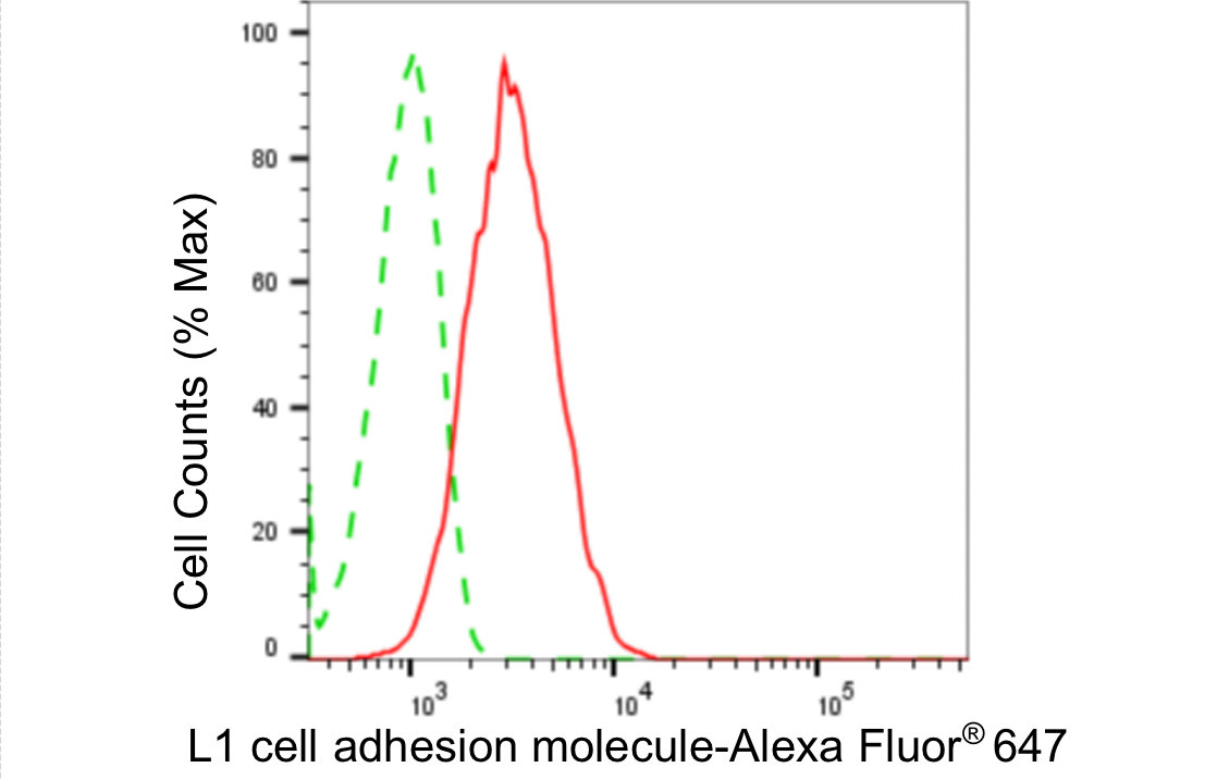 • Flow cytometric analysis of L1 cell adhesion molecule expression in HepG2 cells using L1 cell adhesion molecule antibody. Green, isotype control; red, L1 cell adhesion molecule.