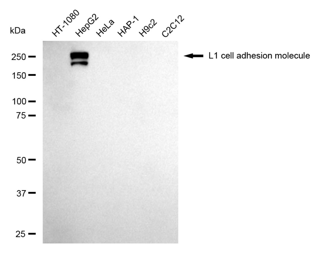 • Western blotting analysis using L1 cell adhesion molecule antibody. Total cell lysates (30 μg) from various cell lines were loaded and separated by SDS-PAGE. The blot was incubated with L1 cell adhesion molecule antibody and HRP-conjugated goat anti-rabbit secondary antibody respectively.