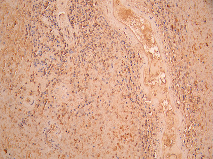 • IHC image of CSB-RA945578A0HU diluted at 1:100 and staining in paraffin-embedded human spleen tissue performed on a Leica BondTM system. After dewaxing and hydration, antigen retrieval was mediated by high pressure in a citrate buffer (pH 6.0). Section was blocked with 10% normal goat serum 30min at RT. Then primary antibody (1% BSA) was incubated at 4°C overnight. The primary is detected by a Goat anti-rabbit polymer IgG labeled by HRP and visualized using 0.05% DAB.
