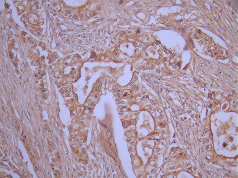 • IHC image of CSB-RA945578A0HU diluted at 1:100 and staining in paraffin-embedded human pancreatic cancer performed on a Leica BondTM system. After dewaxing and hydration, antigen retrieval was mediated by high pressure in a citrate buffer (pH 6.0). Section was blocked with 10% normal goat serum 30min at RT. Then primary antibody (1% BSA) was incubated at 4°C overnight. The primary is detected by a Goat anti-rabbit polymer IgG labeled by HRP and visualized using 0.05% DAB.