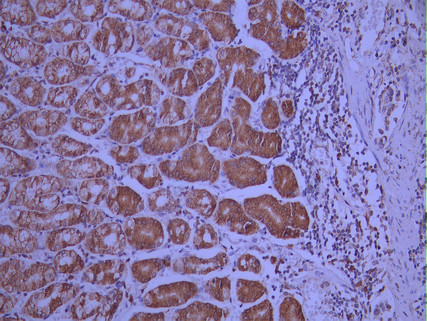 • IHC image of CSB-RA579236A0HU diluted at 1:100 and staining in paraffin-embedded human gastric cancer performed on a Leica BondTM system. After dewaxing and hydration, antigen retrieval was mediated by high pressure in a citrate buffer (pH 6.0). Section was blocked with 10% normal goat serum 30min at RT. Then primary antibody (1% BSA) was incubated at 4°C overnight. The primary is detected by a Goat anti-rabbit polymer IgG labeled by HRP and visualized using 0.05% DAB.