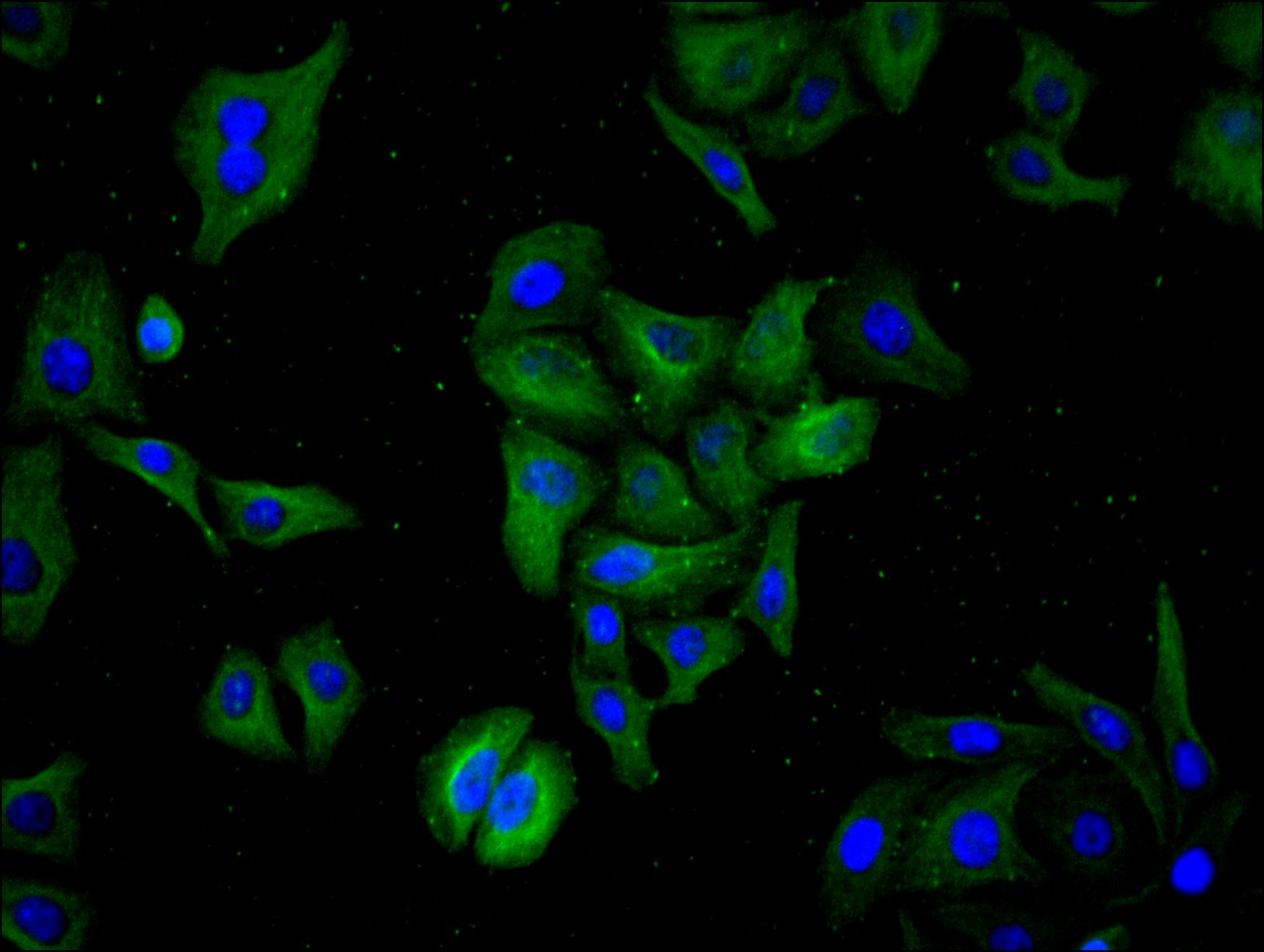 • Immunofluorescence staining of Hela cell with CSB-RA833609A0HU at 1:50, counter-stained with DAPI. The cells were fixed in 4% formaldehyde, permeabilized using 0.2% Triton X-100 and blocked in 10% normal Goat Serum. The cells were then incubated with the antibody overnight at 4°C. The secondary antibody was Alexa Fluor 488-congugated AffiniPure Goat Anti-Rabbit IgG(H+L).
