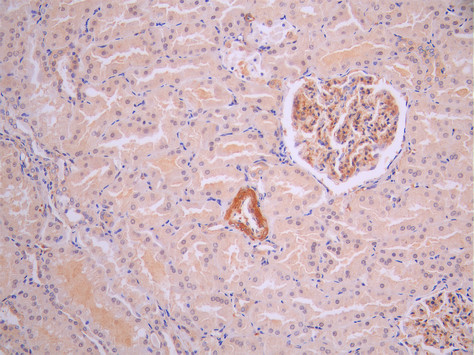 IHC image of CSB-RA179059A0HU diluted at 1:100 and staining in paraffin-embedded human kidney tissue performed on a Leica BondTM system. After dewaxing and hydration, antigen retrieval was mediated by high pressure in a citrate buffer (pH 6.0). Section was blocked with 10% normal goat serum 30min at RT. Then primary antibody (1% BSA) was incubated at 4°C overnight. The primary is detected by a Goat anti-rabbit polymer IgG labeled by HRP and visualized using 0.05% DAB.