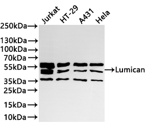 Positive WB detected in: Jurkat whole cell lysate(30μg), HT-29 whole cell lysate(30μg), A431 whole cell lysate(30μg), Hela whole cell lysate(30μg)