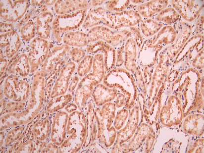 IHC image of CSB-RA155738A0HU diluted at 1:100 and staining in paraffin-embedded human kidney tissue performed on a Leica BondTM system. After dewaxing and hydration, antigen retrieval was mediated by high pressure in a citrate buffer (pH 6.0). Section was blocked with 10% normal goat serum 30min at RT. Then primary antibody (1% BSA) was incubated at 4°C overnight. The primary is detected by a Goat anti-rabbit polymer IgG labeled by HRP and visualized using 0.05% DAB.