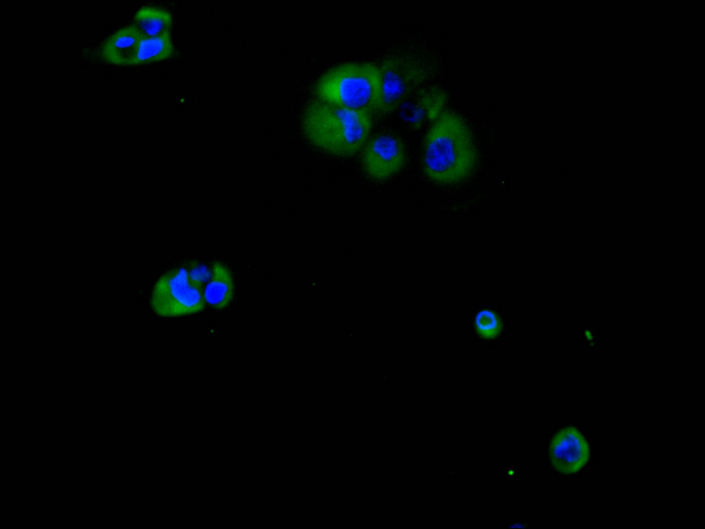 Immunofluorescence staining of A431 cell with CSB-RA788487A0HU at 1:50, counter-stained with DAPI. The cells were fixed in 4% formaldehyde and blocked in 10% normal Goat Serum. The cells were then incubated with the antibody overnight at 4°C. The secondary antibody was Alexa Fluor 488-congugated AffiniPure Goat Anti-Rabbit IgG(H+L).