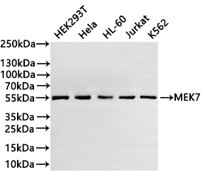 Positive WB detected in: HEK293T whole cell lysate(20μg),Hela whole cell lysate(20μg), HL-60 whole cell lysate(20μg), Jurkat whole cell lysate(20μg),K562 whole cell lysate(20μg)
