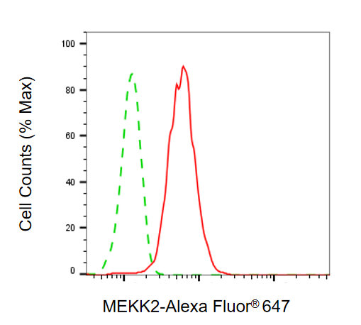 • Flow cytometric analysis of MEKK2 expression in HepG2 cells using MEKK2 antibody (. Green, isotype control; red, MEKK2.