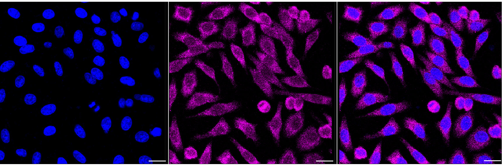 • Immunocytochemical staining of Hela cells with MEKK2 antibody (. Nuclei were stained blue with DAPI; MEKK2 was stained magenta with Alexa Fluor? 647. Images were taken using Leica stellaris 5. Protein abundance based on laser Intensity and smart gain: Medium. Scale bar, 20 μm.