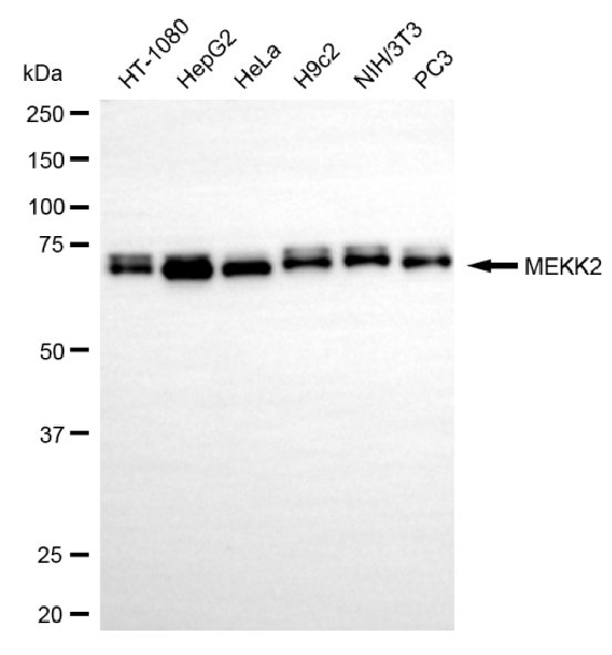 • Western blotting analysis using MEKK2 antibody. Total cell lysates (30 μg) from various cell lines were loaded and separated by SDS-PAGE. The blot was incubated with MEKK2 antibody and HRP-conjugated goat anti-rabbit secondary antibody respectively.