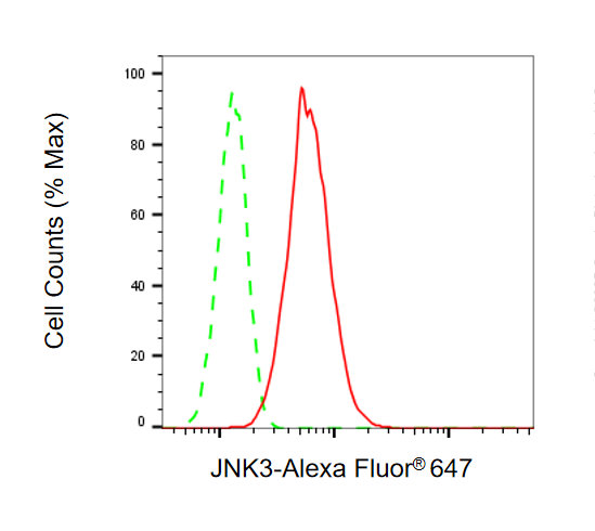Flow cytometric analysis of JNK3 expression in HT-1080 cells using JNK3 antibody. Green, isotype control; red, JNK3.