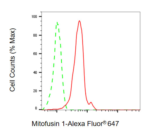 • Flow cytometric analysis of Mitofusin 1 expression in C2C12 cells using Mitofusin 1 antibody. Green, isotype control; red, Mitofusin 1.