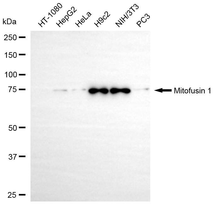 • Western blotting analysis using mitofusin 1 antibody. Total cell lysates (30 μg) from various cell lines were loaded and separated by SDS-PAGE. The blot was incubated with mitofusin 1 antibody and HRP-conjugated goat anti-rabbit secondary antibody respectively.