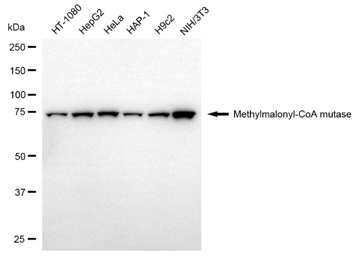 Western blotting analysis using methylmalonyl-CoA mutase antibody. Total cell lysates (30 μg) from various cell lines were loaded and separated by SDS-PAGE. The blot was incubated with methylmalonyl-CoA mutase antibody and HRP-conjugated goat anti-rabbit secondary antibody respectively.