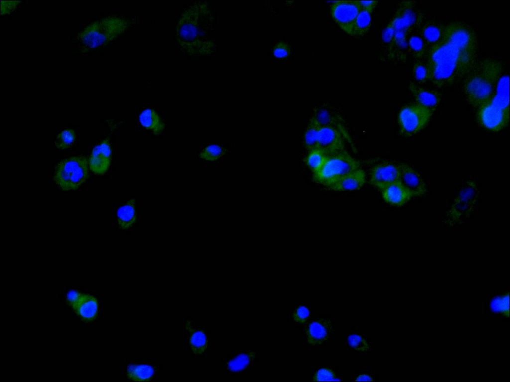 Immunofluorescence staining of HepG2 cell with CSB-RA644699A0HU at 1:50 , counter-stained with DAPI. The cells were fixed in 4% formaldehyde, permeabilized using 0.2% Triton X-100 and blocked in 10% normal Goat Serum. The cells were then incubated with the antibody overnight at 4°C. The secondary antibody was Alexa Fluor 488-congugated AffiniPure Goat Anti-Rabbit IgG(H+L).