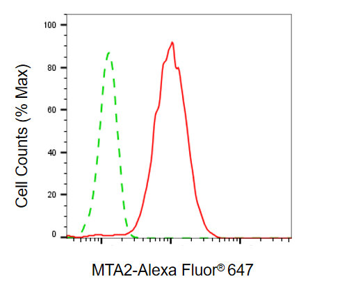 Flow cytometric analysis of MTA2 expression in HepG2 cells using MTA2 antibody. Green, isotype control; red, MTA2.