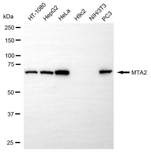 Western blotting analysis using MTA2 antibody. Total cell lysates (30 μg) from various cell lines were loaded and separated by SDS-PAGE. The blot was incubated with MTA2 antibody and HRP-conjugated goat anti-rabbit secondary antibody respectively.